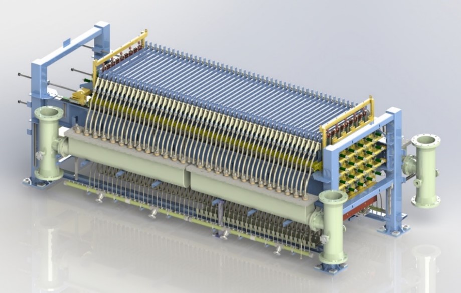 We have been developing and refining the NORSCAND® electrolyzer for over 15 years, drawing on our deep expertise in industrial electrochemistry and scaling up novel electrochemical processes since 1999. Our team has engineered a high current density, bi-polar design featuring a substantial 1.5 m² electrode area. The anode utilizes a titanium expanded metal mesh, offering the flexibility of a DSA-O2 or DSA-Cl2 coating, depending on specific process requirements. The cathode is constructed from stainless steel or nickel-expanded metal mesh.